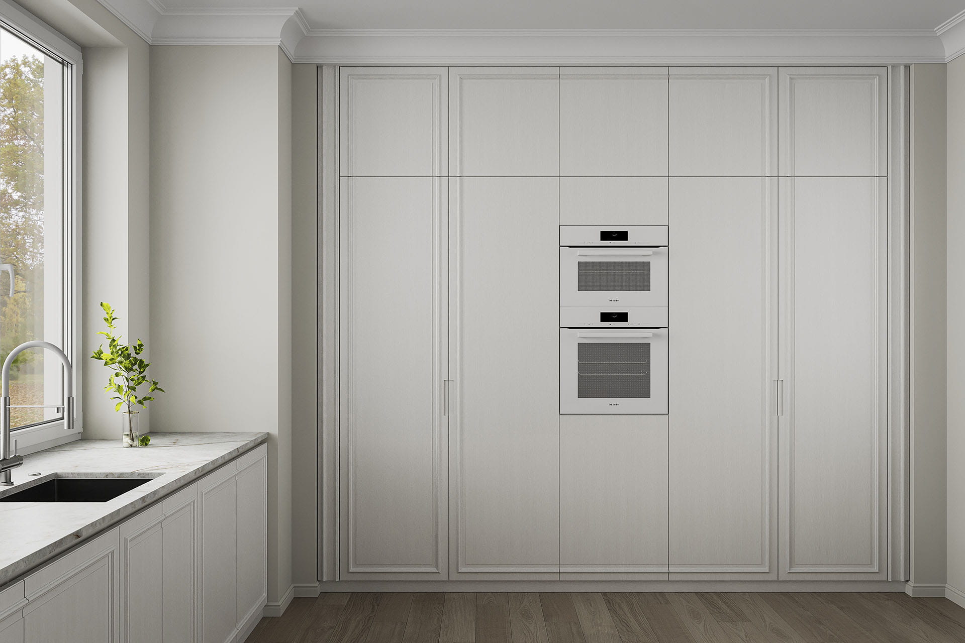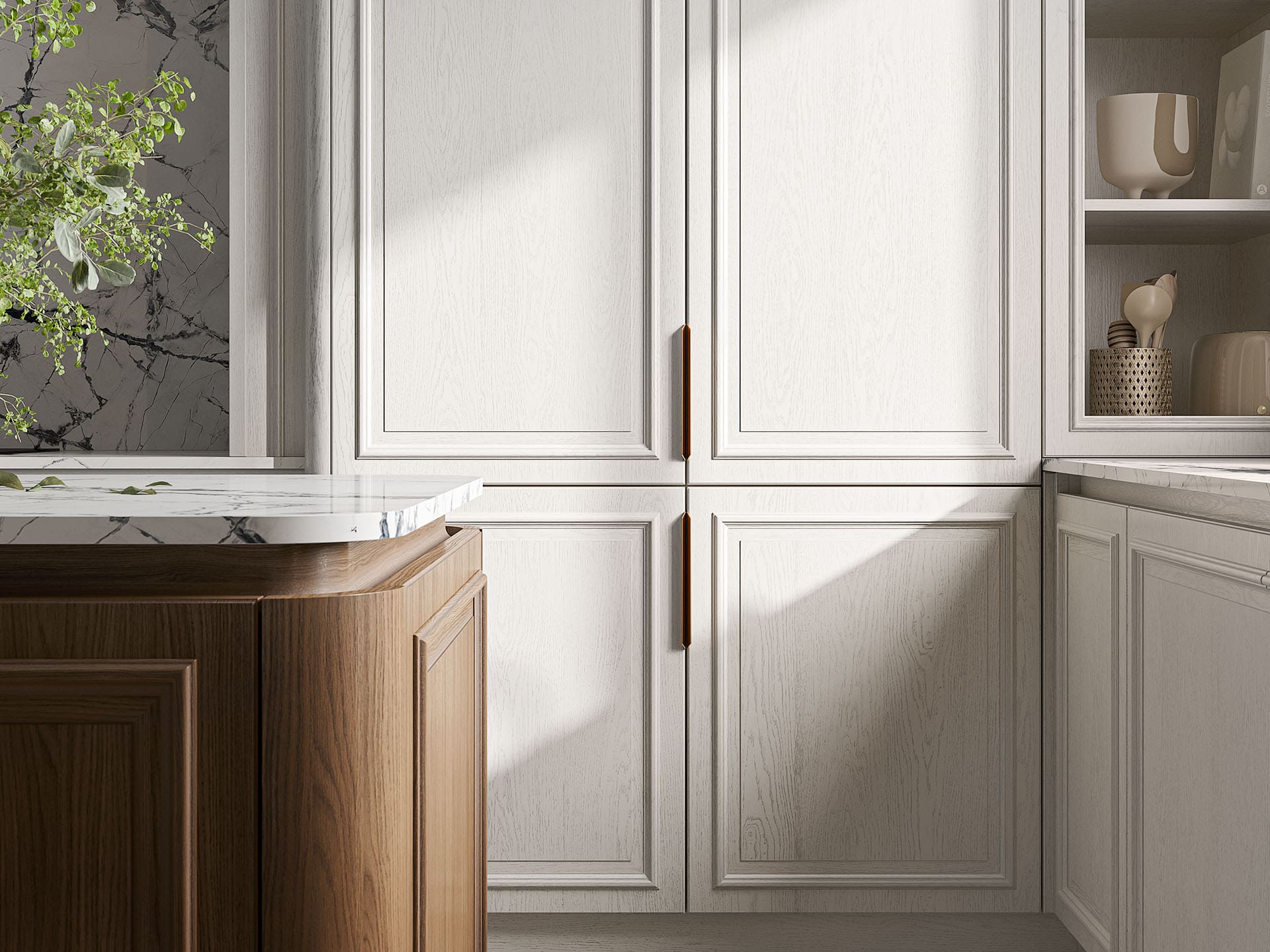 Кухня в стиле неоклассика. Объёмный рисунок фасада Лианги создаётся деревянным фрезерованным профилем. Этот профиль «перетекает» с одного элемента фасада на другой, подчиняясь общей идее дизайнера и формируя таким образом более крупный рисунок на лицевой поверхности кухни. Стильные интегрированные С-ручки также являются важным элементом декора. Доступны также Gola-профиль и накладные ручки. В соответствии с выбранной стилистикой (ближе к классике или модерну) двери шкафов-витрин могут быть с декоративным стеклом либо с прозрачным в сочетании с изящными деревянными раскладками.Похожие модели кухонь